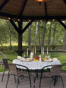 Pirties namelis – buvusi asmeninė mūsų pirtis. Joje atlikome rekonstrukciją ir, pritaikę patogiam poilsiui, pirmuosius svečius priėmėme 2022 m. vasaros pradžioje.